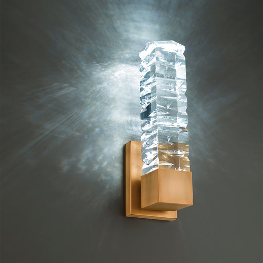 Description Single wall sconces are an elegant way to light the bath environment. Hand-cut and polished crystal is centered on a steel backplate, ...