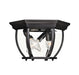 Brighten up your great outdoors with the timeless traditional look of this 3-light outdoor ceiling light. Its lantern inspired structure includes clear beveled glass shades and is finished in versatile black. 7" height, 9" width. Canopy height 1.38", canopy width 9.45", canopy depth 10.83". Max 40 watts per bulb, candelabra size C11 bulbs recommended. LED bulb compatible. Wet area rated.