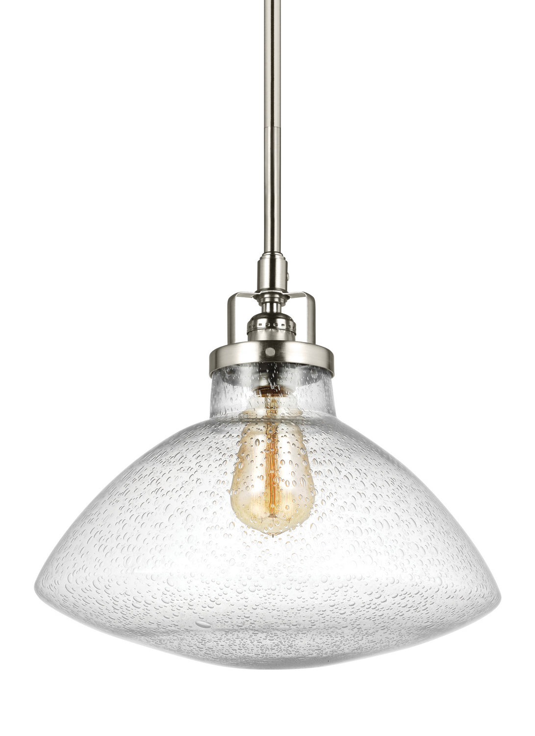 Description Two different types of glass make this pendant feel special and sophisticated. A detailed Aged Brass or Polished Nickel band at the ce...