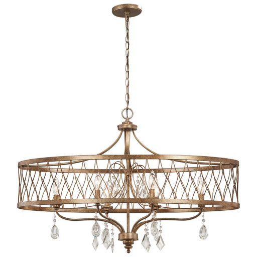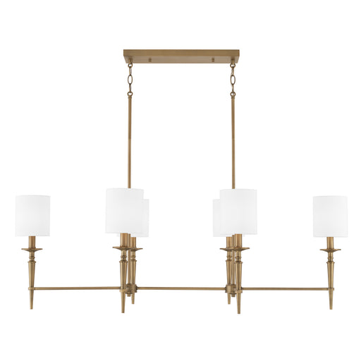 Description Straight edges and ornate candlestick detailing layers of drama to the Abbie 6-Light Island. The Aged Brass finish brings a glamourous...