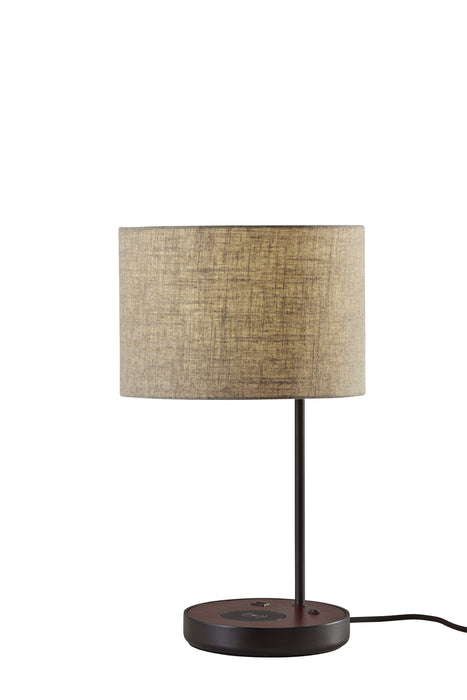 An essential addition to your bedside table, the Oliver AdessoCharge Table Lamp includes a wireless charging pad with Qi inductive charging technology. A matte black finish is mixed with walnut wood for mid-century modern appeal. A natural fabric shade reveals its beautiful texture when lit. Many smartphones (list below) have Qi technology built in, so just place your phone on the pad and it will charge right up. No cords, no mess. It's that easy! All AdessoCharge product is Qi certified by the Wireless Power Consortium. AdessoCharge is unique in that you can use the AdessoCharge pad, the USB and the light all at the same time with maximum efficiency of all three. An easily accessible rocker switch on the base turns the lamp on and off. Just plug in the lamp and the charger will work. This wireless charging pad will charge your phone through most materials, do you do not even need to remove your case! Only metal will hinder the function of the charging pad to charge through the case. If your smartphone doesn't support Qi wireless charging, you will need to purchase a Qi compatible case, which is sold through a variety of retail channels. Or you can also charge your smartphone with the USB port that is also included in the lamp base. Compatible with Apple iPhone 8 / 8 plus / X / Galaxy Note 8 / S8 / S8 plus / S7 / S7 edge / S6 / S6 edge / S6 edge+ / Nexus 4 / 5 / 6 / 7 / LG G3/ Microsoft Lumia 1520, 1020, 930, 929, 928, 920