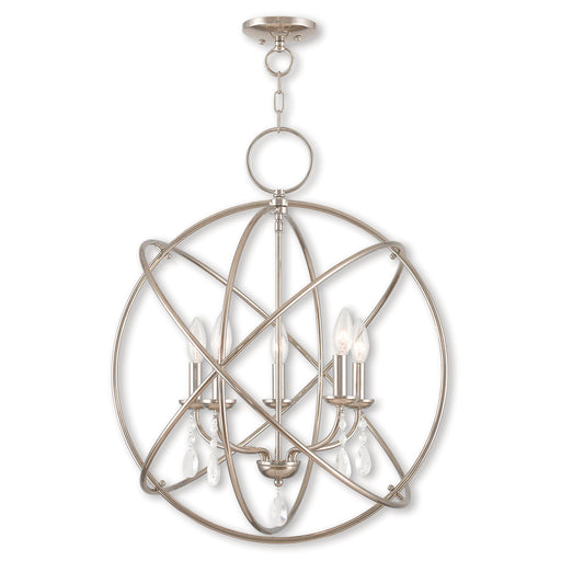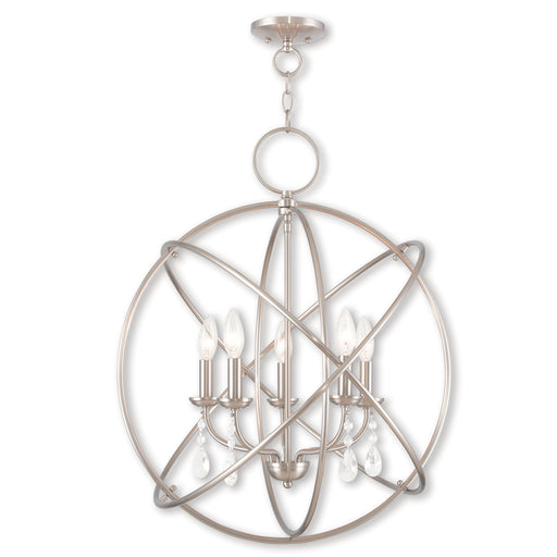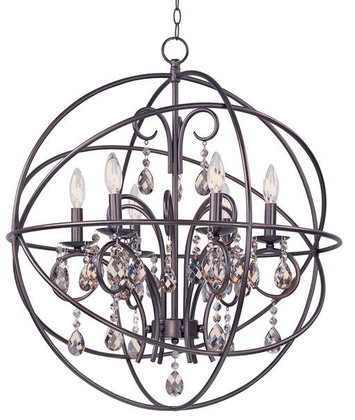 Description A spherical frame of metal surround a simple line chandelier draped in crystal for a transitional style that fits any interior design....