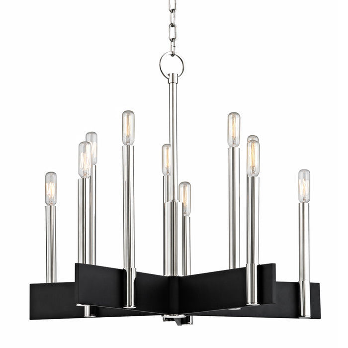 A stark work of minimalist sophistication, Abrams mounts elongated candlesticks of finely finished metal into wide black cross-pieces. These monolithic, textured black arms form a striking juxtaposition with the smooth, round candlesticks. Each arm, both on sconce and chandelier, contains a socket on either side. An exposed carbon-filament bulb is the natural choice for lamping, rounding the piece out.