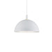 Single-lamp pendant with aluminum dome shade showcasing powder-coated or plated finishes with metal details and a matte white interior. Exterior shade colors are black, brushed nickel, or white. Suspended by cloth cable. Available in three sizes.