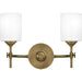 Complement your bathroom with the mid-century modern style of the Aria collection. Finished in a Weathered Brass, the thin arms and knob details give this fixture a retro, vintage feel. The opal etched glass shades diffuse light and provide a warm glow.