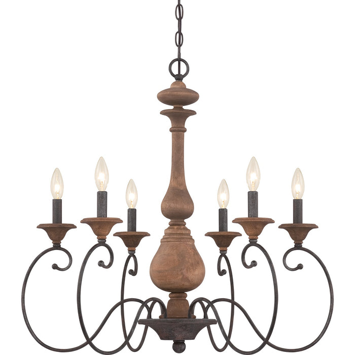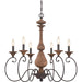 Natural aesthetics and a feminine style bring the European inspired design of the Auburn Collection to great heights. The finish is a textured and rich Rustic Black with an aged appeal that is featured on the scrolling arms and candle sleeves. The beautiful walnut stain highlights the unique wood patterns that make this chandelier everlasting.