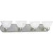 The Avalon collection is characterized by casual, flowing elements. A braided metal motif provides subtle decoration and distinguishing highlights. Overscaled glass adds the finishing touch to this transitional design. Four-light bath bracket with swirled alabaster glass in Brushed Nickel finish.