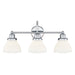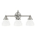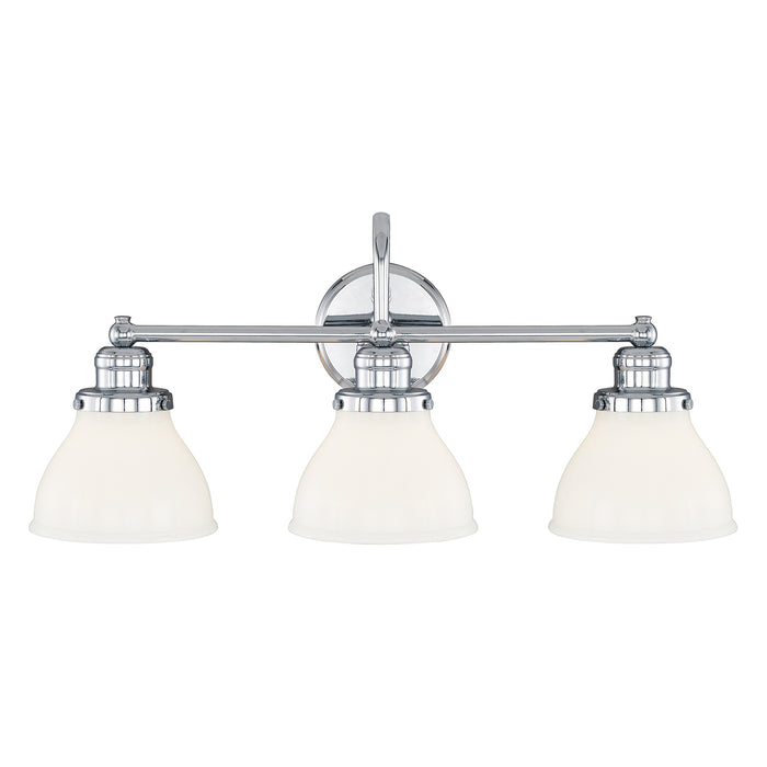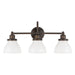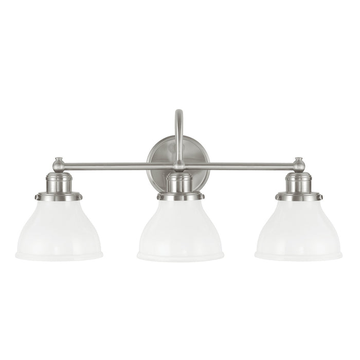 Our Baxter 3-light vanity stands out with its stunning visual contrasts. A frame finished in Burnished Bronze supports Milk glass shades, their gentle contours mirroring the curved arm while offsetting the slim, straight profile.