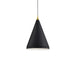 Single lamp pendant with conical aluminum shade with fine powder-coated or plated finishes with contrasting finial. Exterior shade colors are black or white with gold detail or brushed nickel with black detail. Suspended by cloth cable. Available in 3 sizes.