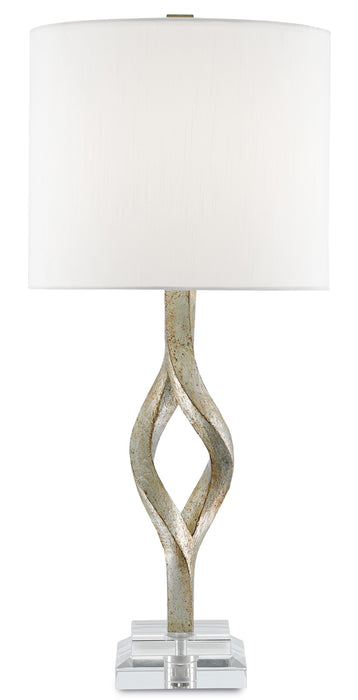 Elyx 1-Light Table Lamp in Chinois Silver Leaf with Off-White Shantung Shade