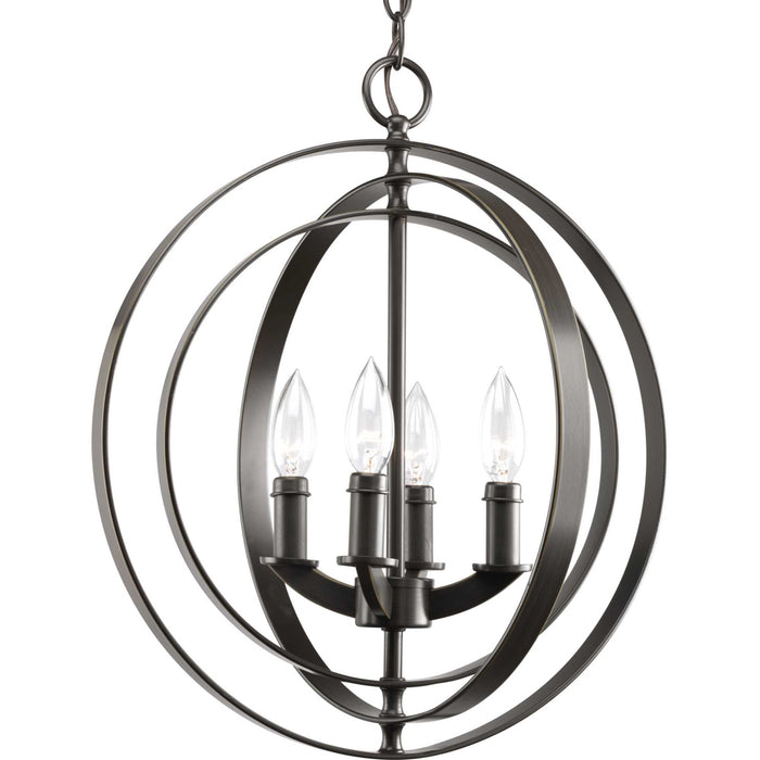 Inspired by ancient astronomy armillary spheres. This oversized oval fixture is part of the stunning Equinox collection. Interlocking rings pivot for an infinite variety of positions. Four-light foyer pendant in a Polished Nickel finish is ideal for linear installations over a farmhouse table, dining room setting or kitchen island.