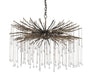 The embodiment of dark beauty, the Fen Chandelier draws upon the allure and mysterious unknown of mossy wetlands for inspiration. Cupertino wrought iron spokes stretch outward like gnarled branches, each one supporting a delicate chain adorned with a single crystal bead, like drops of dew on a bramble bush. The brutalist design of this six-light fixture is both innovative and irresistible. This chandelier also comes in a smaller version.