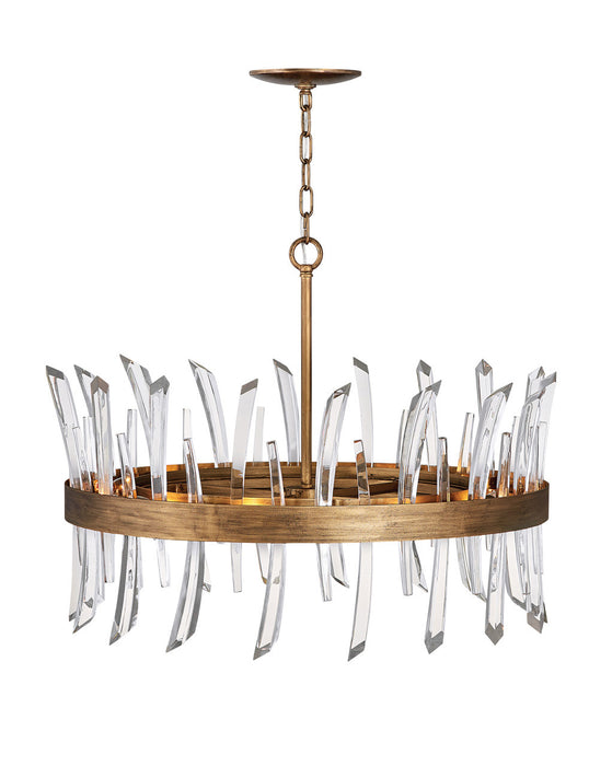 A compelling design that captivates from any angle, the Revel family gleams with sophistication. Luxurious crystal rods are honed into unexpected asymmetrical formations to produce an organic elegance that is both raw and refined. Revel's linear and circular chandeliers are available in both Burnished Gold and rich Black finish options.
