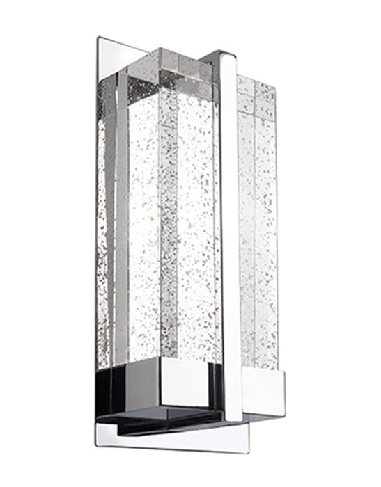 This intensive LED wall sconce is one of a kind. Build with heavy gauged steel, plated in two finishes brushed nickel or polished chrome. With a solid rectangular bubble encased crystals which sits directly above LED board. When lit the crystal expels the light with beautiful patterns on the wall and around the room. Equipped with our powerful 12V AC LED technology