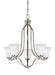 The Emmons five light single tier chandelier in brushed nickel is the perfect way to achieve your desired fashion or functional needs in your home. The Emmons lighting collection by combines form and function in a traditional empire silhouette. Trumpeted Satin Etched glass shades and a circular finial further enhance the design. Cluster three sizes together in a multi-fixture installation to make a beautifully dramatic statement in the living room, foyer, entryway or family room. The Emmons collection comes in two finishes: Brushed Nickel and Heirloom Bronze. Its assortment includes three-, five- and nine-light chandeliers, one-light mini pendant, three-light pendant, two-light semi-flush mount, one-light wall sconce, and two-, three- and four- light bath vanity fixtures. Incandescent and ENERGY STAR-qualified LED lamping are available, all fixtures are California Title 24 compliant.