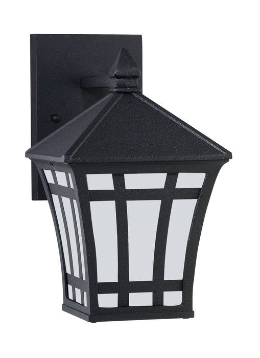The Herrington one light outdoor wall fixture in black enhances the beauty of your property, makes your home safer and more secure, and increases the number of pleasurable hours you spend outdoors. There is real curb appeal in the design details of the Herrington outdoor lighting collection by . Traditional elements are updated with contemporary lines with a sense of Asian-inspired styling. In a classic Black finish, the assortment is offered in both Clear Seeded and Etched White glass and includes a small and large one-light outdoor wall lanterns, a one-light outdoor pendant, a one-light outdoor post lantern and a two-light outdoor ceiling flush mount. Herrington is available in incandescent and ENERGY STAR-qualified LED models (Etched White Glass fixtures only), and all fixtures can easily convert to LED by purchasing LED replacement lamps sold separately.
