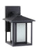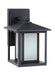 The Hunnington one light outdoor wall fixture in black creates a warm and inviting welcome presentation for your home's exterior. A bit of Shaker minimalism mixed with Arts and Crafts styling defines the transitional Hunnington outdoor lighting collection by . Equally at home in the city or the country, this timeless style will enhance the appearance of a home's entrance with its clean, crisp lines. Offered in Weathered Pewter or Black finishes, with either Etched Seeded glass or Clear Seeded glass, the assortment includes a one-light outdoor pendant, small and large one-light outdoor wall lanterns, a one-light out door post lantern and a two-light outdoor ceiling flush mount. Both incandescent lamping and ENERGY STAR-qualified LED lamping (for those fixtures with the Etched Seeded glass) are available for most of the fixtures, and some can easily convert to LED by purchasing LED replacement lamps sold separately (for those with the Clear Seeded glass).