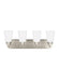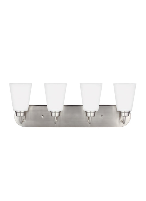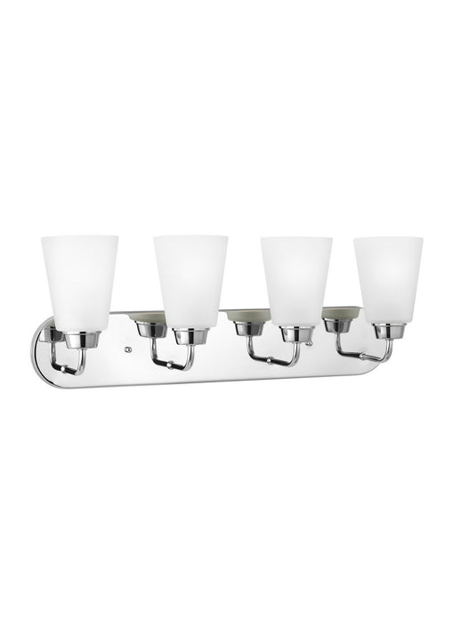 The Kerrville four light vanity fixture in chrome provides abundant light for your bath vanity, while adding a layer of today's style to your interior design. With a simple, airy appearance, the Kerrville lighting collection by embraces its modern design roots while enhancing virtually any homes decor. Tubular steel arms extend outward and curve to present beautiful tapered, Satin Etched glass shades. The collection has a Brushed Nickel, Burnt Sienna or Chrome finish and offers three-, five- and nine-light chandeliers, a one-light mini pendant, one- and three-light pendants, a two-light semi-flush mount which can convert to a pendant, and one-, two-, three- and four-light bath fixtures. Incandescent and ENERGY STAR-qualified LED lamping are available, all fixtures are California Title 24 compliant.