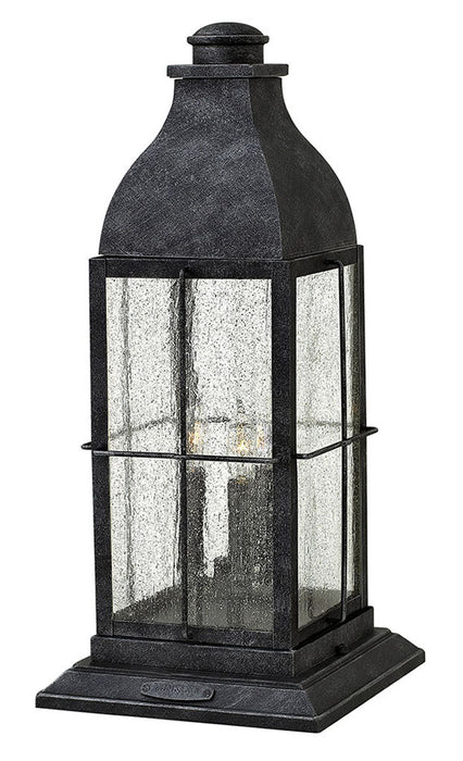 Bingham's traditional style recalls a turn-of-the-century gas light reproduction. The vintage look is nautical in nature and recognizes Hinkley's origins on the shores of Lake Erie. The aluminum construction features clear seedy glass and a Greystone finish, while candelabra lamping completes the authentic style.