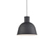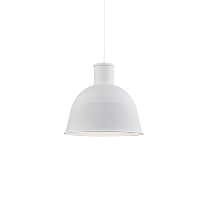 Single-lamp pendant with aluminum dome shade showcasing powder-coated finishes. Exterior shade colors are black, white or blue, with matte white interior. Suspended by cloth cable to a maximum 120" length. Available in three sizes.