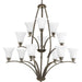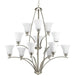 Gleeful simplicity defines this twelve-light, three-tier chandelier from the Joy Collection. Refreshing and fashionable arcing forms of Brushed Nickel metal arms enhance the etched white fluted glass. Coordinating fixtures from this collection let you decorate an entire home with confidence and style. Unique stem-hung construction carries the clean line all the way to the ceiling and, for sloped ceilings, ten feet of 9 gauge chain is provided to allow the fixture to hang straight and level.