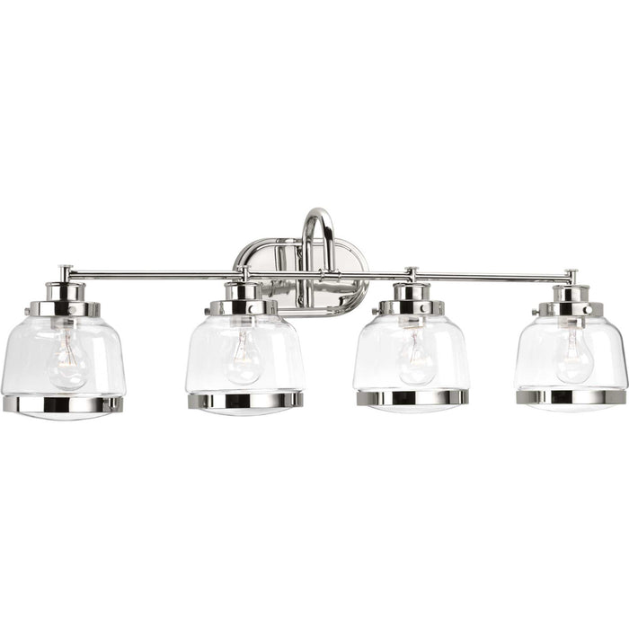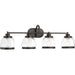 The Judson collection features a timeless clear schoolhouse-style globe. Metal fittings add distinction to complete the vintage look. Judson provides the perfect compliment to farmhouse or coastal-inspired homes. Four-light bath & vanity in an Antique Bronze finish.