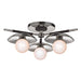 Setting sculpted satellites against bars and cords, Julien feels contemporary. Polished opal diffusers softly and evenly disperse LED illuminance. Julien manages to feel at once mid-century modern and futuristic. Its textured black and metal contrast, its satellite shades, and its LED bulbs make it an attractive and environmentally conscious choice.