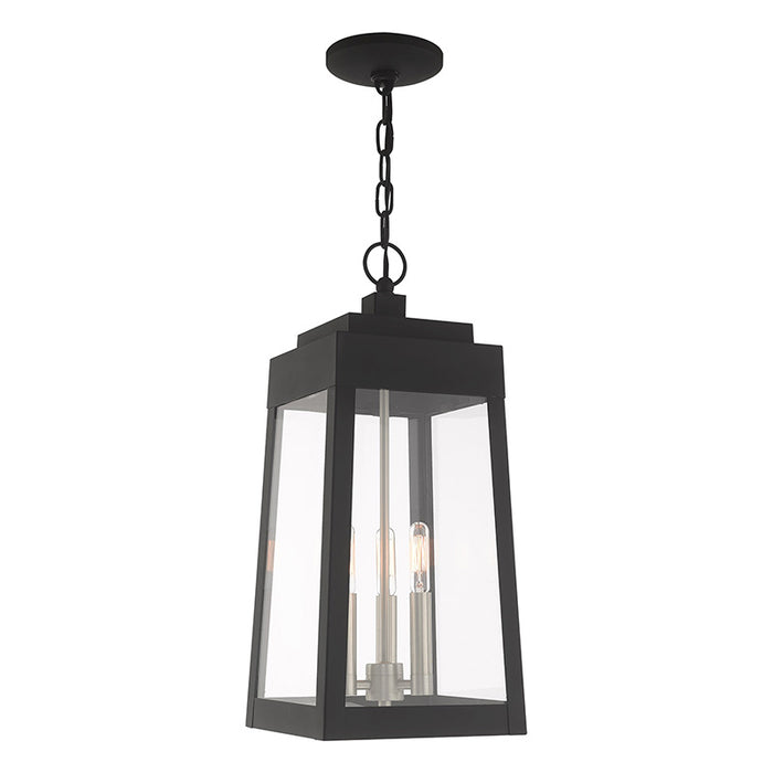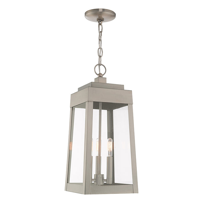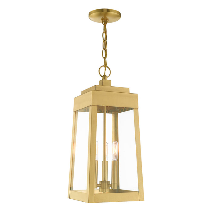 This updated industrial design comes in a tapering solid brass satin brass frame with a sleek, straight-lined look and features clear glass panels.