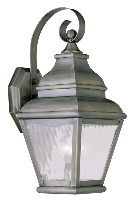 Finished in antique brass with clear water glass, this outdoor wall lantern offers plenty of stylish illumination for your home's exterior.