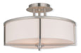 The brushed nickel finish on the frame complements the exquisite, hand crafted off white hardback drum shade and a satin opal glass diffuser guarantees a soft illumination.