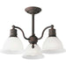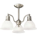 The Madison collection features etched glass with transitional elements. Simplified vintage style. Three-light 20-3/4" semi-flush close-to-ceiling fixture. Brushed Nickel finish.