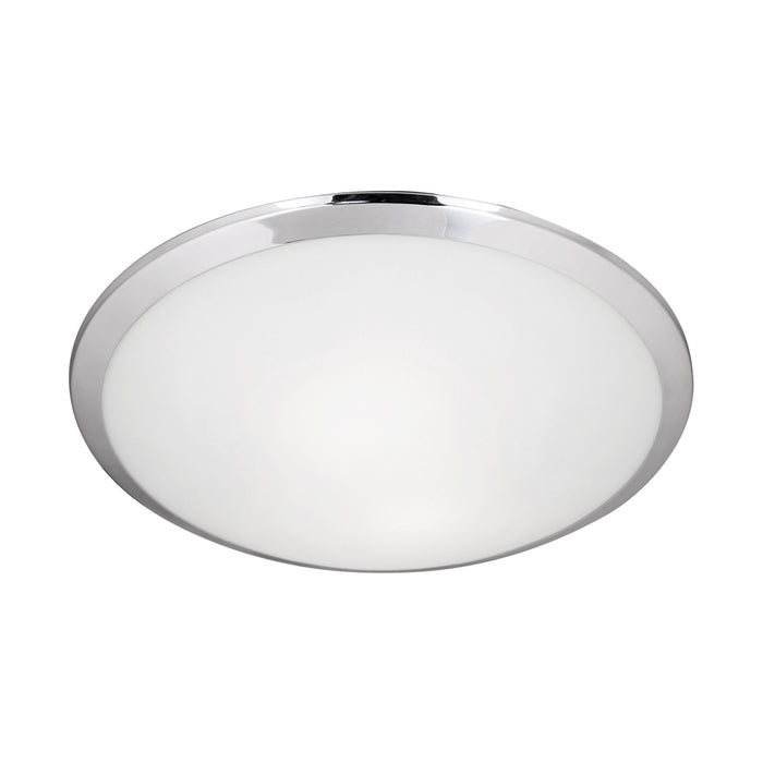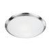 Two lamp flush mount ceiling fixture with white opal glass and your choice of brushed nickel or chrome metal finish.