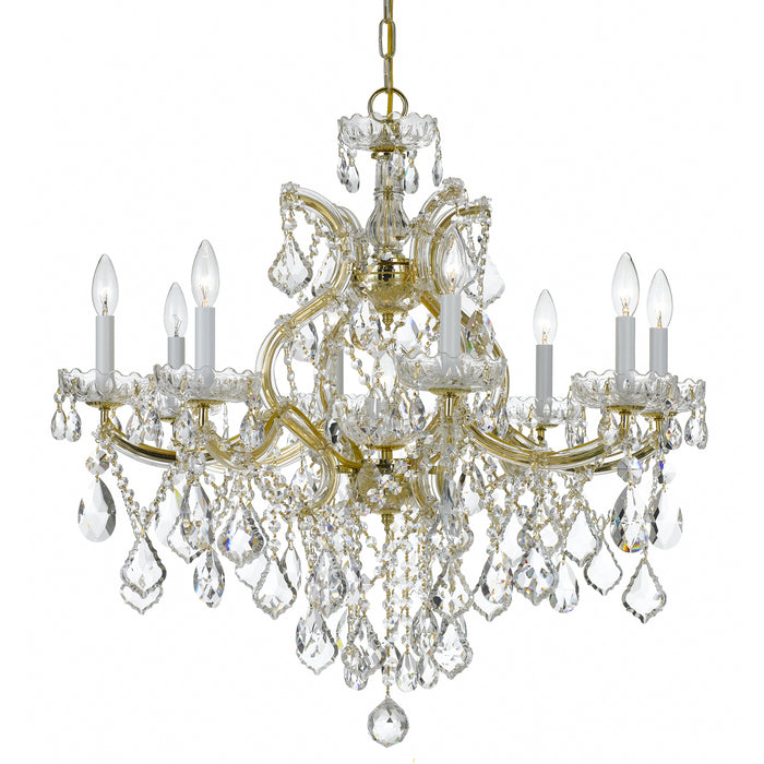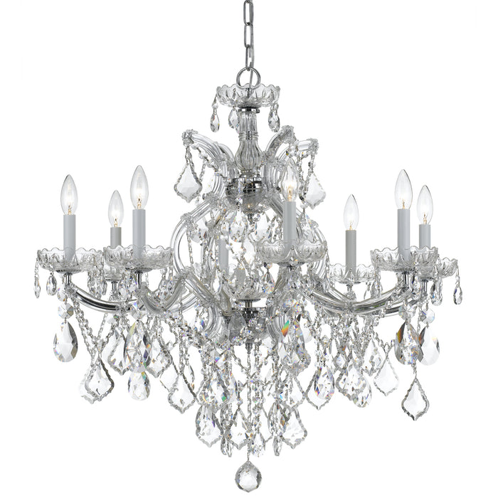 Draped in an abundance of crystal, the Maria Theresa collection is the epitome of high style. The chandelier is stunning with a Polished Chrome hue frame decked with strands of faceted clear hand cut crystal. The fixture showcase opulence and decadence and is the perfect traditional accent to any space. Whether in a living room, kitchen, dining room, or even closet or hallway, this fixture bring a luxurious additional to any decor.