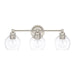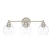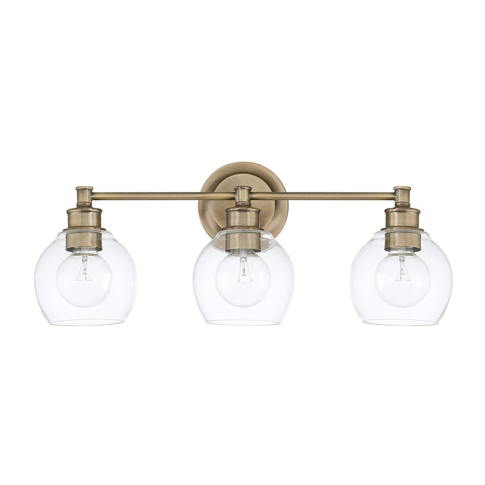 Our Mid-Century 3-light vanity fixture embraces the revival of warm and earthy finishes as a trend to create a cozy, relaxing space. With a soft sheen that's not as ornate as gold but just as impressive, the Aged Brass finish gives off subtle visual texture. Paired with clear, rounded glass that mimics wine glasses, this vanity light washes the bathroom or powder room in elegant illumination. This fixture is also available in a Polished Nickel finish.