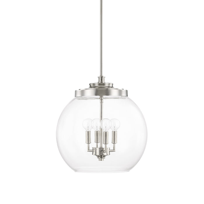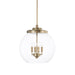 Clear, rounded glass encases four lamps in this Mid-Century pendant. Perfect for producing task lighting above an island, dining table or desk, this elegant, minimalistic fixture helps create a clean, uncluttered aesthetic. The Aged Brass finish is easily coordinated with complementary gold tones or with other finishes for a mixed metal design concept.
