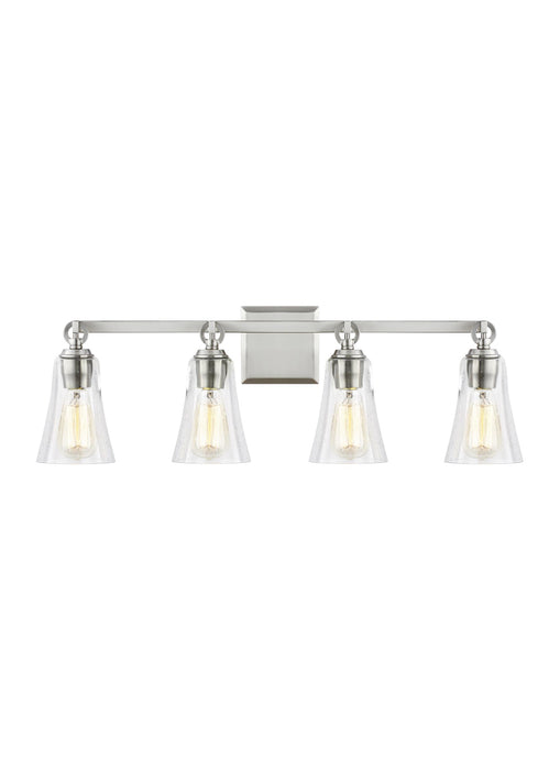 The Sean Lavin Monterro four light vanity fixture in satin nickel provides abundant light for your bath vanity, while adding a layer of today's style to your interior design. Monterro features beautiful tapered glass shades and exquisite cast details, including a cast backplate, cast ring, and hook hardware that elegantly supports the shades. The Chrome version is available with two glass options, either White Opal Etched glass or Clear Seeded glass, while the Burnished Brass, Satin Nickel finish is available in Clear Seeded glass only.