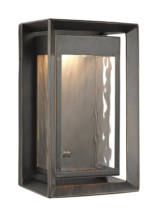The Urbandale one light outdoor wall fixture in antique bronze creates a warm and inviting welcome presentation for your home's exterior. The Urbandale outdoor collection by has a modern design which features beveled edges achieved with the fine precision of crisp die-cast construction. Both incandescent and LED versions are available, and each offer slightly different aesthetic. The incandescent version is offered in the Antique Bronze finish which nicely contrasts with the Painted Burnished Brass finish on the squared-off candle holders and Clear Seeded glass to subtly obscure the light source. The LED version is offered in an Antique Bronze finish with Clear Water glass.