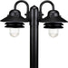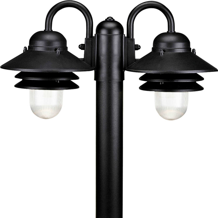 Two-light post mount plastic fixture with prismatic acrylic shade in a textured Black finish.