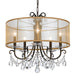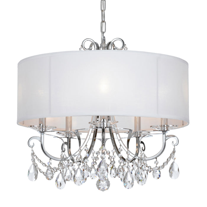 Elegant shades are enriched with ornate crystal for an updated look to a classic drum chandelier in the Othello collection. This chandelier features detailed scroll metal work finished in polished chrome and is draped with stunning clear hand cut crystal. Perfect for a living room, dining room, or even an entryway, this fixture will be a conversation starter in any space.