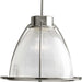 One-light 16" pendant with prismatic glass shade for a sleek industrial look. Clear prismatic glass is highlighted with brushed nickel accents.