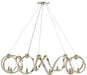 The Ringmaster Chandelier is cold-forged and requires a team of strong men to achieve its stellar design. A contemporary silver leaf finish is applied to the graceful wrought iron curves of the silver version of the fixture to resemble a very regal slinky. Ten lights provide the ultimate illumination emanating from the undulant fixture. We also offer this chandelier in a contemporary gold leaf finish.