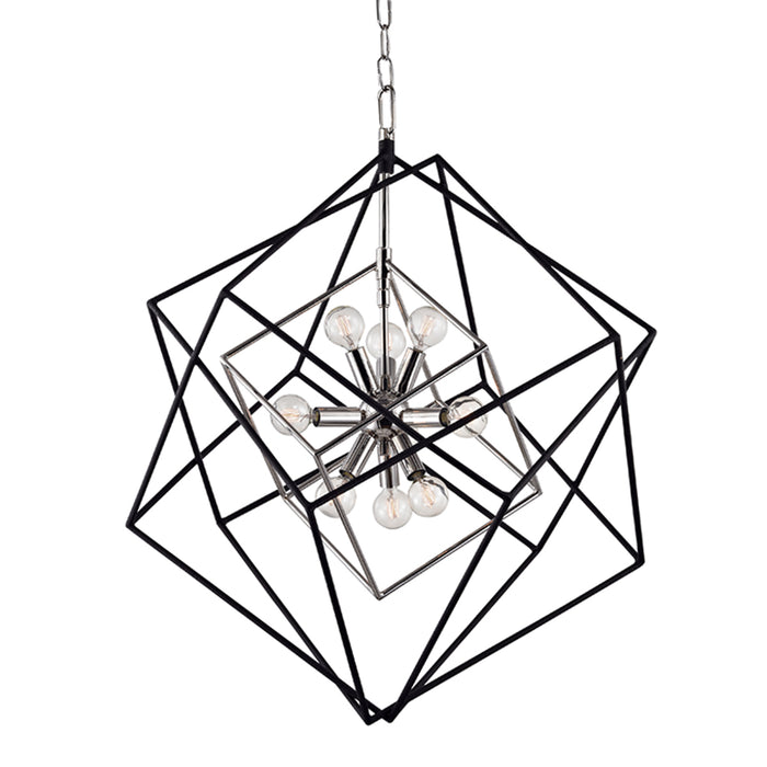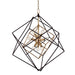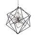 Tumbling cubes overlapped in frozen motion surround a modern-style lighting cluster in this breathtaking fixture. Inert textured black iron contrasts with a metallic finish at core. This chandelier manages to feel utterly contemporary while nodding to the Atomic Age, celebrating the tension that keeps the universe and the atom alike in perfect place.