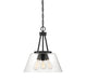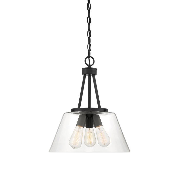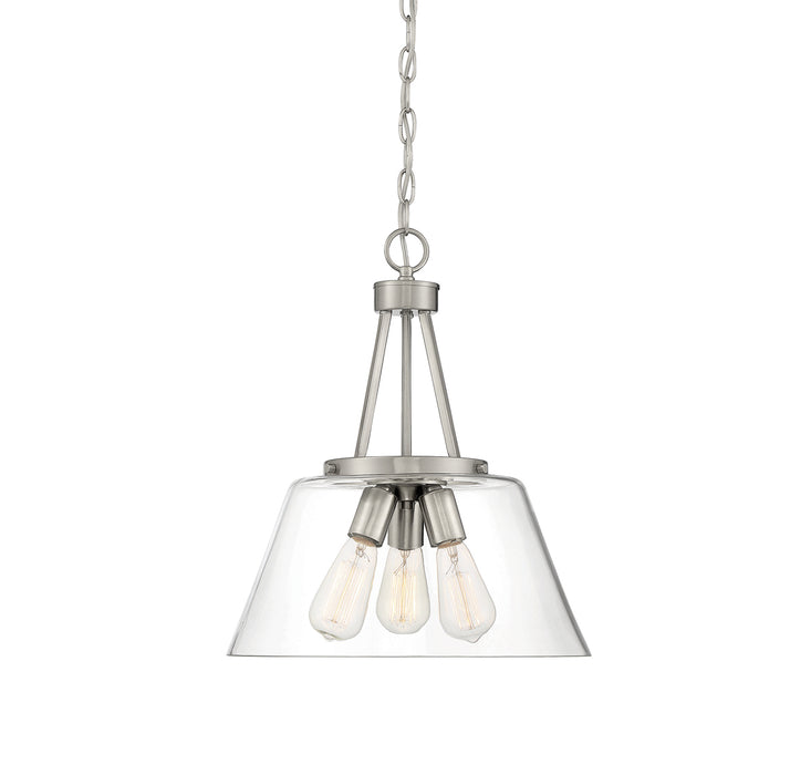 The Calhoun Collection is distinguished by simple lines that can easily enhance transitional and contemporary d�cor. Measuring 18" high x 15" wide, this three-light pendant offers a clean silhouette in a Warm Brass finish and clear glass shades. It is illuminated by three 60-watt Edison-base bulbs.