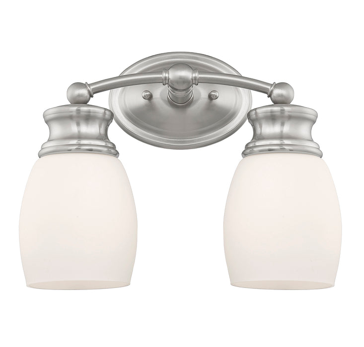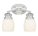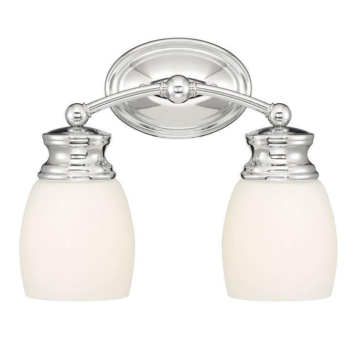 You want to feel comfortable when you step up to the vanity mirror, and that�s exactly what happens with the Elise. The traditional style is clean-lined and familiar, and the light is flattering, without any glare. The oval wall plate holds a graceful, curved arm and handsome glass holders, featuring nicely decorative, yet uncluttered, detailing. And this entire structure has a sparkling, polished chrome finish. Tapered cylindrical shades are made of lovely, frosted opal glass, and surround two 60W, E-style bulbs. The bath bar is 12.25� wide, 10� high, and UL rated for damp locations. It may be mounted as uplight or downlight �the perfect fixture for luxurious, inviting style in your bathroom or powder room.