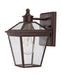 Brighten the exterior of your home and welcome your guests in style, with the Ellijay wall lantern. The design mimics a vintage gas lantern, with a classic, tapered box shape and decorative top finial. A sumptuous English bronze finish adds traditional flair, and blends well with other hardware and architectural materials. Panes of clear glass fill all four side panels �and the roof panels, too. One 60W, E-style bulb provides inviting and secure illumination. This lantern measures 6� wide, 9.75� high, and extends 7� from the wall. You�ll enjoy its timeless style and enhance the beauty of your property, whether on your porch, patio, sunroom, pergola, or other outdoor walls in your garden and yard.
