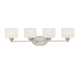 Flattering light? Check. Stylish appearance? Check. The Kane bath bar has all the requirements for terrific bath lighting. The oval wall plate, straight light arm bar, and chunky, curved shade holders have streamlined detailing, highlighted by a brushed, satin nickel finish. The color of the frame is a wonderful complement to the splendid white, etched glass shades. Inside each of these four rectangular shades is a 60W, E-style bulb: ample soft light, filtered through the white glass, makes everyone feel comfortable. This fixture is 33� wide, UL rated for damp locations, and may be mounted as uplight or downlight. The Kane makes the task of choosing a beautiful, high style light fixture for your bathroom or powder room, easy to complete!