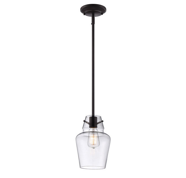 This mini-pendant has streamlined, classic style! The understated bulb socket has a rich, dark English bronze finish. And the frame holds a curved, apothecary jar-shaped shade made of pristine, clear glass. One downward-facing 60W, E-style bulb allows ample illumination through the clear glass �and using an Edison or exposed filament bulb will add to the vintage charm. Overall, it has a timeless, sophisticated appearance. The pendant is 7� wide, 10.5� high, and has a 10.5 to 42� adjustable hanging height. It�s a perfect size to hang alone, in pairs, or grouping several together for maximum impact. And it�s sure to bring vintage appeal to your dining room, kitchen, living room, bedroom, hallway, family room, office, or stairway.