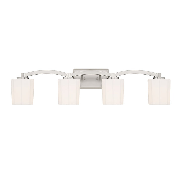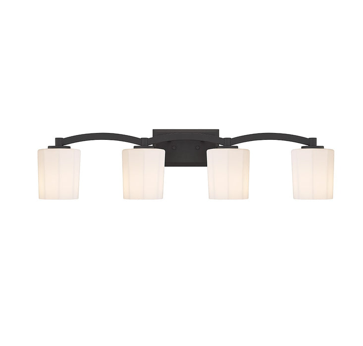 Get understated glamour for the bathroom with this Savoy House Whitney 4-light bath vanity light. Fluted shades of opal etched glass offer up a flattering glow, the curving arm adds intrigue and the warm brass finish adds versatility. Whitney is 8" in height, 33" in width and extends 6.50" from the wall. It uses four standard size bulbs of up to 60 watts per bulb (bulbs not included).
