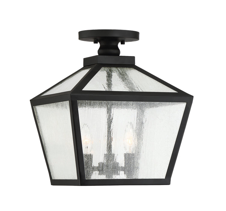 The traditional charm of vintage lanterns blends beautifully with streamlined, contemporary appeal in this Woodstock outdoor fixture. Everyone who enters your home will feel welcomed, and appreciate its classic style. High-quality matte black finish matches with every sort of architectural element and color palette. The greenhouse-like frame of the lantern is suspended from a semi-flush mounting. Clear seeded glass panes add wonderful textural interest and allow maximum illumination that is both safe and attractive. Three metal candle covers hold 60W bulbs. 12� wide by 14� high size is perfect to place this lantern on an outdoor ceiling in a porch, entry, covered patio, sunroom, or pergola.