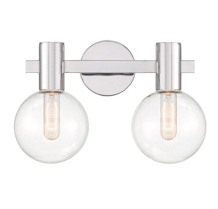This Savoy House Wright 2-light bath vanity light showcases streamlined style that makes it ideal for any bathroom. Round clear glass shades add an extra dimension and extra protection for the light bulbs within. Chrome finish. Wright is 15.5" in width, 10" in height and extends 7.5" from the wall. Uses 2 standard size bulbs of up to 60 watts per bulb (bulbs not included). We recommend using tubular shaped bulbs.